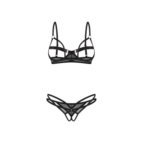Show your bold and confident side with this two-piece set designed for women who refuse to compromise. The open bra and cut-out thong create a modern, striking and self-assured look. The straps around the bust form an intriguing geometric pattern, subtly framing the curves. With underwire support, the bra stays comfortable and secure while maintaining its provocative appeal.