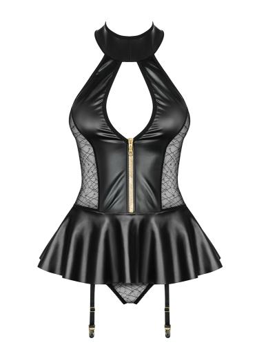 Il 859-COR-1 Corset & Perizoma di Obsessive unisce eleganza audace e sensualità. I pannelli lucidi valorizzano le forme, mentre lo scollo profondo e il colletto alto aggiungono un tocco drammatico. La zip frontale è pratica e seducente allo stesso tempo.